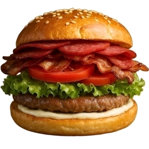 Pão, hamburguer, alface, tomate, bacon, maionese e salame