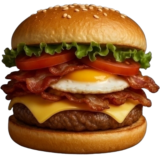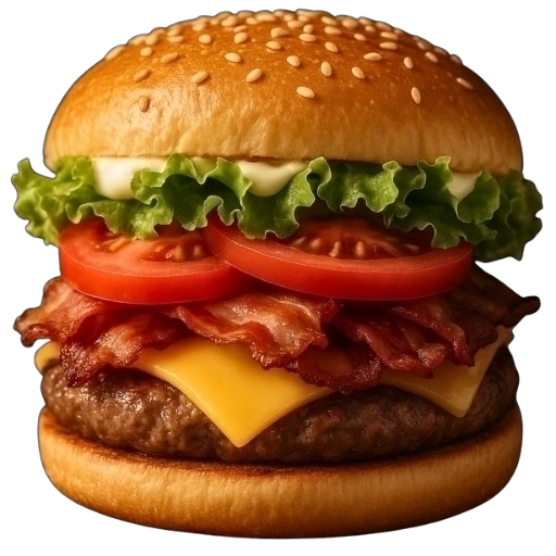 Hamburguer, queijo prato, bacon, rodelas de tomate, alface e maionese